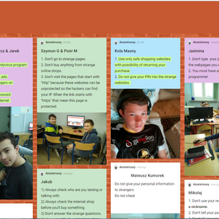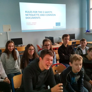 Tym razem uczniowie klasy VII pod opieką pani Magdaleny Czarneckiej i pani Katarzyny Pławeckiej spotkali się poprzez Skype’a z uczniami z Norwegii, aby wspólnie ustalić zasady bezpiecznego korzystania z Internetu i reguły pracy nad dokumentami tworzonymi online w zespole. Do spotkania uczniowie przygotowywali się już wcześniej opracowując temat z zastosowaniem aplikacji Padlet i wypełniając ankietę w Google Survey.